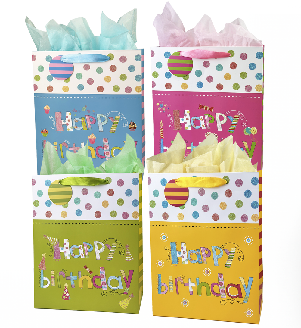 Happy Birthday Gift Bag - dot patterns, assort 4styles: Large