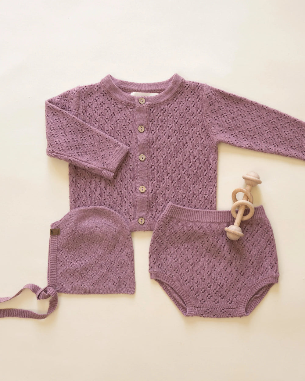 Pointelle sweater knit bonnet with classic chin ties—a charming accessory for cooler days.