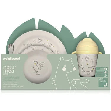 An eco-friendly bamboo dining set of five pieces made up of a flat plate for solid food. Includes a bowl, a spoon and fork set, just the right size for a baby’s first meals, and a learning mug with comfortable handles, straw, and anti-drip sealing system. Manufactured with bamboo fibers, a very hard-wearing and light natural material, in order to teach little ones the importance of looking after the environment and respecting the world in which they live. Dishwasher safe.