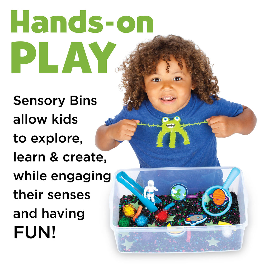 Complete a space mission while engaging your sense of touch with an outer space themed sensory bin! Play with space rocks, squishy aliens and planets to build fine motor skills and promote sensory development Parents and children can enjoy hours of imaginative play together! Complete cognitive tasks found in the illustrated instructions like “Naming each item and creature” to encourage thought, perception and knowledge in your child Place your self-contained bin on a towel to prevent mess while your scooping, digging and playing with the included sensory materials! Hands-on play is a great way to prepare your child for preschool! While on an intergalactic mission your children will learn to explore, create and engage When your family is done playing and engaging with the sensory bin, upcycle it by planting flowers or storing small toys and keepsakes inside, crafters can also recycle their bin to do their part in saving our Earth!