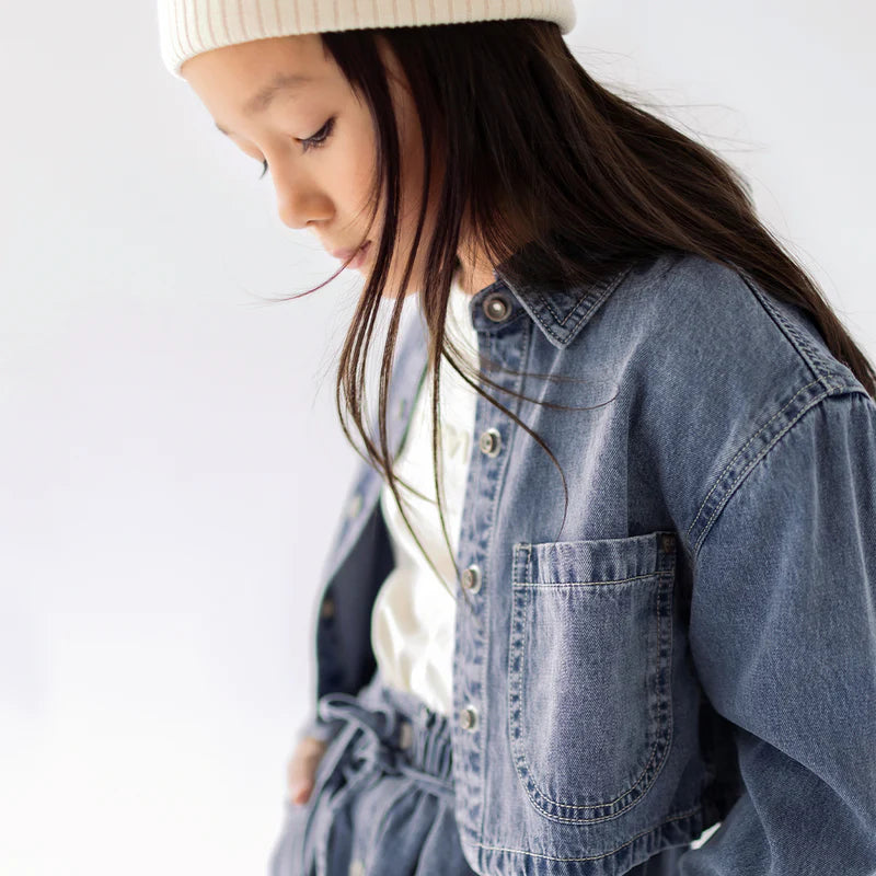 It's a piece that pairs well with a colorful collection bottom, whether shorts, skirt or pants. But it can also be adorable in a full denim outfit like a button-down skirt.