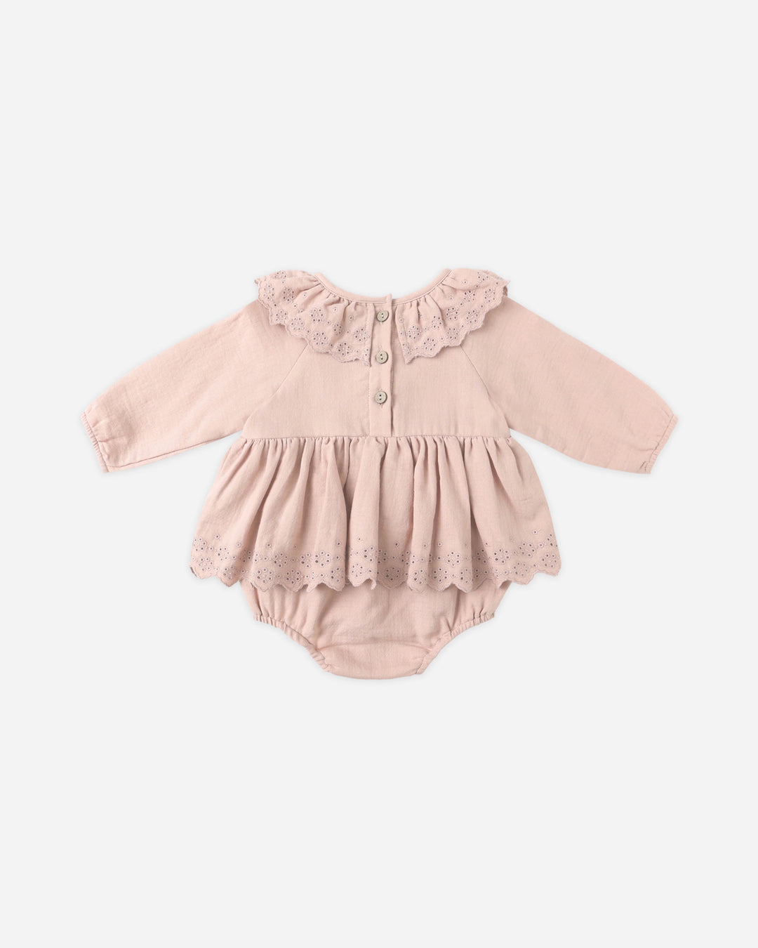 Our Thalia Romper features a sweet collar, embroidered detail, a gathered waist, coconut buttons down the back, and bottom snaps for easy changes.