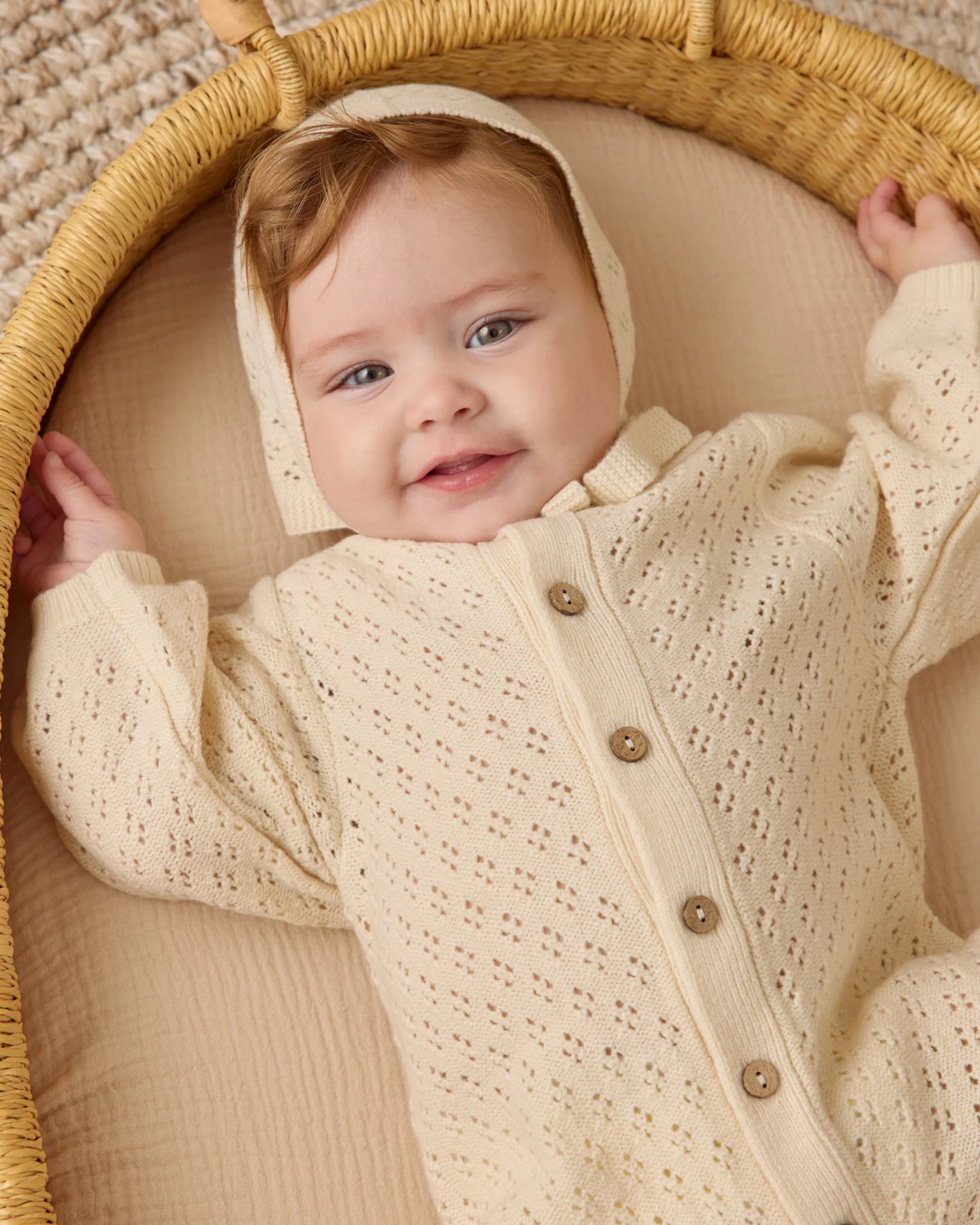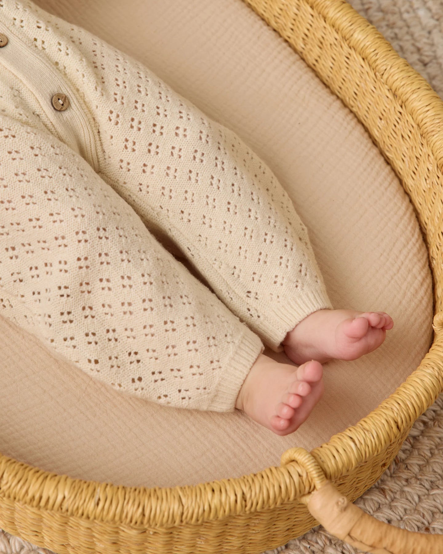 This long sleeve romper, crafted from soft pointelle fabric, features front coconut buttons and a darling bubble silhouette.