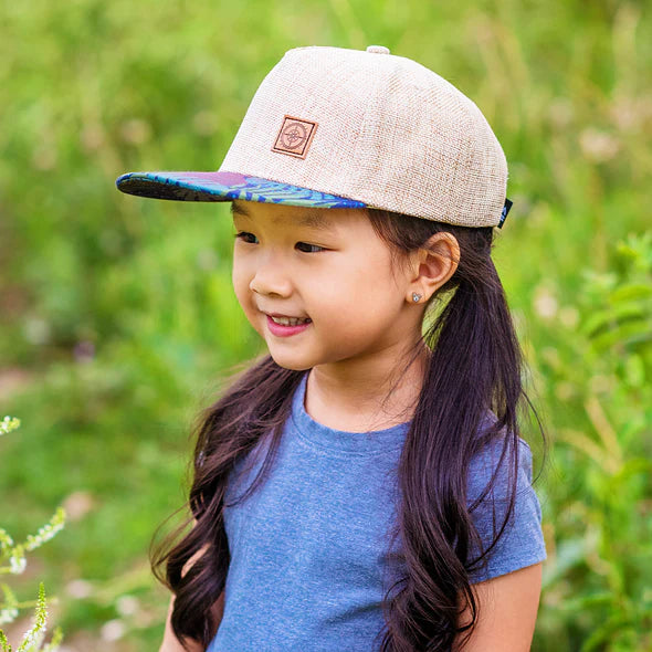 For your adventure-loving little wanderer, this "San Blas" kid's, toddler, and adult hat is adorned with a small, brown compass patch on a light linen hat with a custom print tropical floral fabric on it's flat brim. This one is super special and is the perfect back to school accessory.